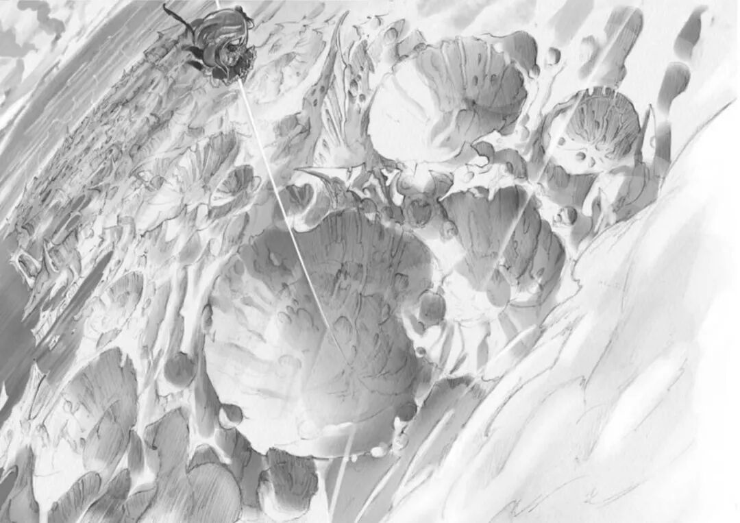 绘本里常见的可爱系画风,旁白主体的叙事方式,这些都是营造童话所必需梦幻感的要素,也不失为一种作者功力的体现。尤其值得一提的是,土笔的画工实际十分优秀,尚不谈绝美而富有层次感的大幅风景,放大服饰道具这些细节处,都常能看到大量的纹理划痕等等精细结构。不计成本地用合页描绘庞大异艳的自然风景,再将有着稚嫩娃娃脸和纤细身躯的角色置于其中显眼之处,作者用这种方式使魔幻色彩浸透了作品,也着实为读者带来了视觉与心灵上的双重震撼。