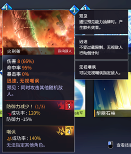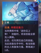 『过载』机制是游戏对我方角色连续行动的限制,如上图中的『雷霆剑』技能,以及2号位角色头像右边的技能,其消耗法力值以紫色显示,这些技能都带有『过载』。一位角色打出一张带有『过载』的牌时,这名角色在同一回合中再打出『过载』牌时就需要额外消耗一点法力值。而如3号位角色头像右边的技能,其消耗法力值以蓝色显示,这些技能都带有『迅速』。与『过载』相对,打出带有『迅速』的技能并不会在法力值上被加以限制。