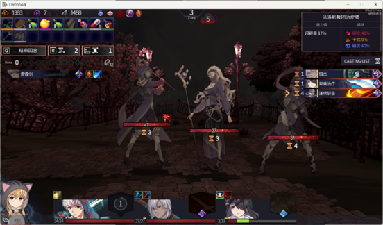 所有的战斗都会有一个总倒计时,仍以此图为例,上方的1Turn/5代表着,这场战斗在第五回合以后会进入黑雾阶段:我方在回合开始时会承受额外的痛苦伤害,同时敌人的行动会更快,意味着我们根本不可能与敌人打持久战。