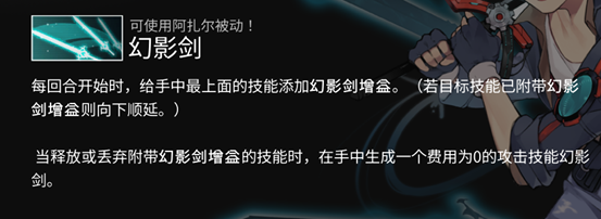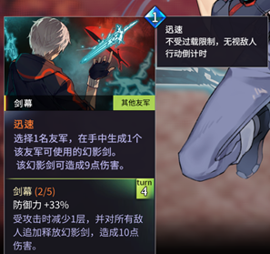 但是,图中的刺猬和熊的箭头标记意味着,这两个敌人拥有嘲讽能力。如果我们想要绕过他们去解决这只讨人厌的木马,就需要能够无视嘲讽的能力;但2号位的西尔弗斯坦过嘲讽能力相当孱弱,三四号位角色则分别是治疗和辅助角色。图中的通用技能『速攻』带有无视嘲讽,而我方1号位的阿扎尔可以在手牌中印出大量的可以带有迅速、无视嘲讽的0费『幻影剑』技能。