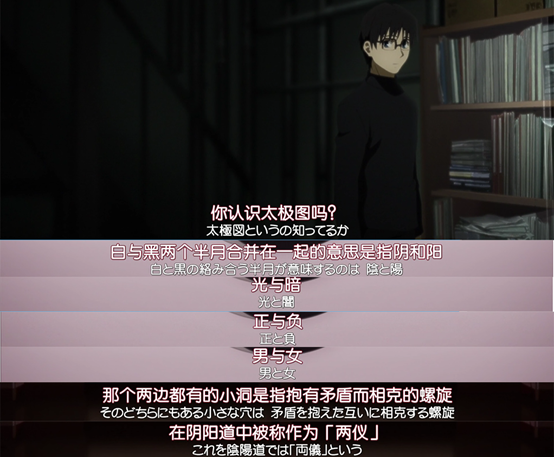 《易传》说“易有太极,是生两仪”,两仪家的姓氏便来源于此。太极图阴阳两分,互为对立而又浑然一体,是矛盾对立的完美体现。《空之境界》要表达的正是这样一个以“矛盾”为主题的故事。