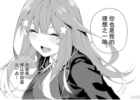 其实回顾《五等分》的故事,三玖是五姐妹中转变最大,成长最明显的一个,而这一切根源都是她对于自己喜爱之人的执着。因为风太郎随口一说“喜欢会做饭的女孩”,她就努力学习厨艺,甚至高中毕业后选择去上一所厨师学校,即使最初的她是一个绝对意义上的“料理白痴”。而结局自然是成功的——在上杉勇也(风太郎之父)的帮助下,她与二乃一起开了一家咖啡厅,而且生意蒸蒸日上。她是一个会为了爱情而不断改变自己的人,当剧情发展到中后期,察觉到其他姐妹对风太郎的感情后,为了不让自己的情感因为害羞而无法闪光,她甚至克服了心底的自卑与羞涩,变得越来越勇敢大方甚至扑倒了风太郎,并成功地让风太郎了解了自己的心意。即使在最后的竞争中输给了四叶,这份恋情为她带来的成长也一样无比珍贵。