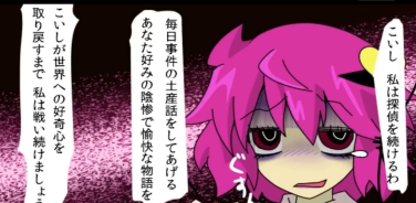 古明地觉,外号小五,东方project的人气角色,被赋予了侦探的身份(爱好),在轮椅上担任主角一职。让主角第一话就因车祸坐上轮椅,无疑是个大胆而新奇的想法。然而鉴于觉读心的能力(通过第三只眼),其侦探的身份才是最有趣的矛盾点。笔者最初猜想会存在某些限制性的设定以回避或淡化这一设定,但作者在第一话就打出明牌:在大段的推理后,觉表示开始就使用了能力。这样的处理让观众在会心一笑的同时,不再在意“读心”与“推理”的冲突。(事实上后续内容中读心能力很少被用于直接破案)