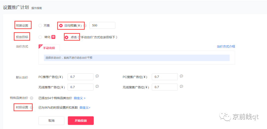 海投能调整的地方就是预算调整,出价以及黑名单否定词时间折扣等版块。