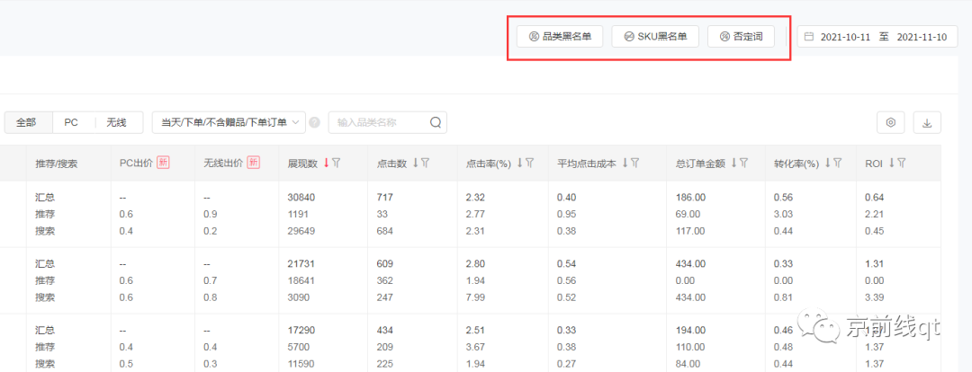 比如有展现投产没有的品类以及SKU都可以拉黑,目的是让海投投放的产品展现更好的集中到投产好的产品上。分析的话可以每周为周期分析一次,拉黑一些无效的关键词,让进店流量更加精准,提高投产。