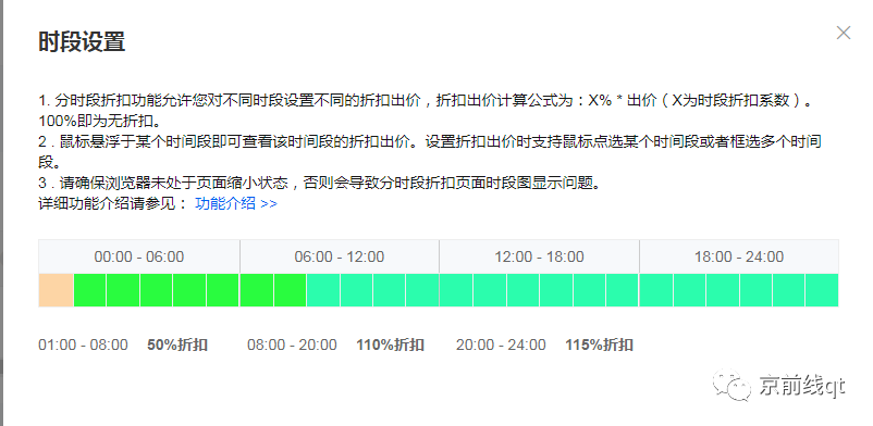如果是新手卖家可以前几天开启全时段,然后再根据数据去调整比例。如果是老店有经验的可以直接根据商智里面成交客户分析里成交客户时间段或者精准通里面找下用户下单时间,分段去进行溢价,像我一般习惯高转化时间段设置到100%或者更高一些,转化低的时间段可以调整溢价到60%-80%都可以,这个具体看数据反馈去调整就可以。理论上来说设置的越高越有机会抢到流量,同时呢成本也会增加,所以需要我们在流量与成本之间把控好,最好是通过ROI来作为参考。