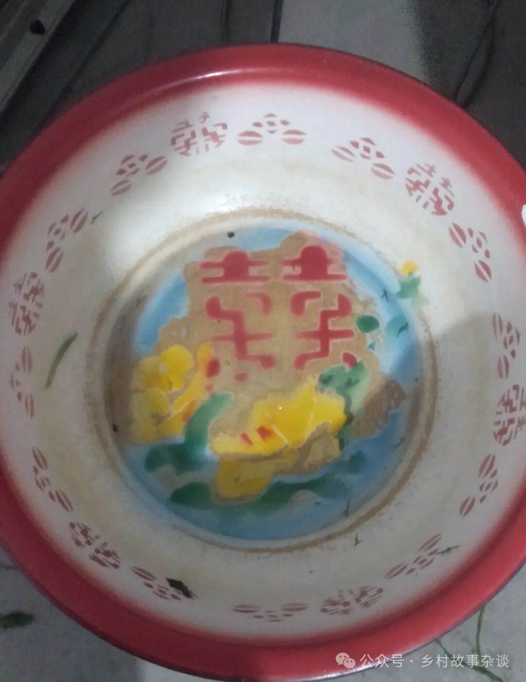 原来的搪瓷盆里的喜字显得格外醒目,这盆子一定承载了家人对母亲的美好祝愿。