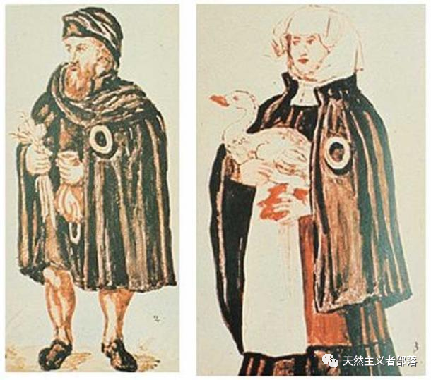 一对来自德国沃尔姆斯的犹太夫妇,他们的衣服上带有强制性的黄色徽章。这个人拿着一个钱袋和大蒜球,这两种东西经常被用来描绘犹太人。16世纪。(公共领域)