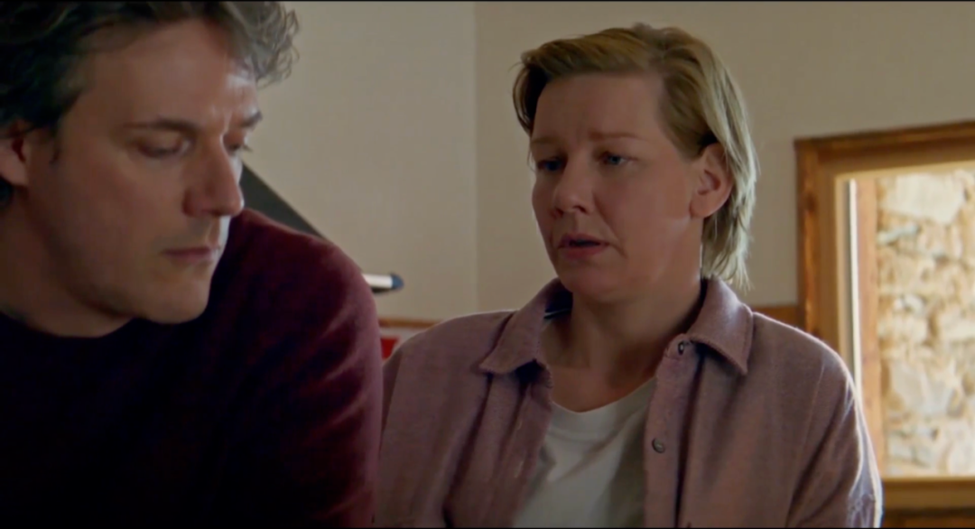 剧中, Samuel 会把一家三口平日的互动对话录下来,用以写作的灵感和素材。此时作为证据,在法庭上播放了一段长达10分钟的吵架录音,将观众带回 Samuel 死亡前一天的画面,揭开了这桩婚姻里的矛盾:一家人搬来法国的乡下,是因为几年前 Samuel 没有及时赶到学校接儿子 Daniel ,致使儿子遭遇车祸重创视神经几近失明,Samuel
