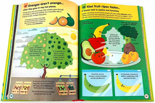 比如下图的这个食物主题,左面这页讲的是桔子不总是桔黄色的,热带地区的桔子皮就不会变黄。而右边说,把猕猴桃和苹果、西红柿放一起储存,熟得更快。