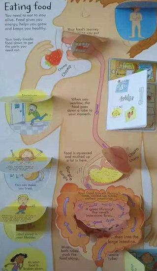 比如,这页讲吃东西的时候,食物进到身体之后都会发生什么。胃可以翻开,里面就是食物在胃里的样子。上面还有一个小冰箱,门拉开之后,里面就是各种食物。