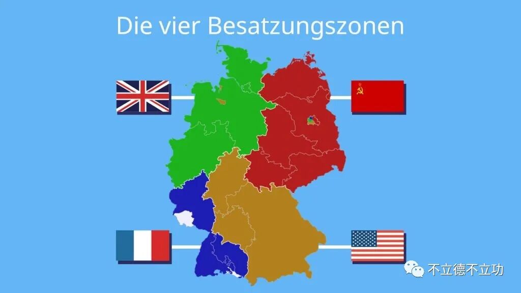 战争同盟不复存在之后,各占领当局之间的利益与意见冲突必然导致不可逆的全面对立,于是分道扬镳。1949年,先是由美、英、法主导合并各自占领区,然后依循程序建立起德意志联邦共和国(德文缩写BRD,当时简称为西德)。苏联占领区紧随其后,也在同一年宣布建立德意志民主共和国(德文缩写DDR,当时简称为东德)。究其实质,1949到1990年间德国分裂的开端是在德国战败投降,处于没有国际法上地位时,只能接受占领当局的处置。占领军四强分裂为两大阵营,所以德国也相应被分裂成分属不同营垒的两个政治板块。