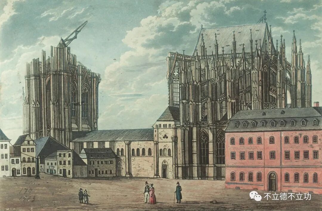 提到科隆,自然会让人联想起当地的地标性建筑科隆大教堂——那栋双塔楼的哥特式建筑典范。“危楼高百尺,手可摘星辰”的科隆大教堂历史久远,早在1248年就开始动工修建。在神圣罗马帝国百衲布式的政治版图之下,雄心勃勃的科隆大教堂工程是被其他诸侯讥嘲为科隆大主教的面子工程,所以根本得不到其他邦国的参与和襄赞。因为宏图浩大兼资源有限,所以工程时断时续,有将近三百年时间是处于任凭雨打风吹的停工状态,成了德语区乃至整个欧洲范围内有名的烂尾楼。虽然世界上几座有名大教堂的营建都旷日持久,但至少都是“日拱一卒”一般持续不断地添砖加瓦,少有像科隆大教堂那样长期抛荒的。直到“普鲁士1807─1815年改革”的时代,科隆大教堂仍然是处于被弃置的状态。然而,拿破仑横扫德意志所带来的休克,反而促动了德意志民族的全面反思,作为痛定思痛后徐图进取的象征,科隆大教堂的命运却是迎来了转机。