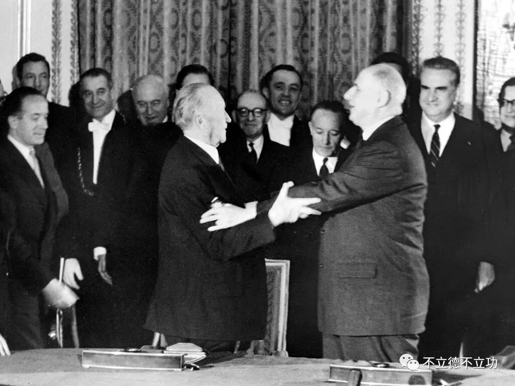 直到经历了第二次世界大战的“惨不堪言”才带来了否极泰来的转机。德、法两国的有识之士不再拘泥于两国之间历史、文化的差异所带来的对立与冲突,使他们在思想的摸索中走到一起的是毫无折扣的共识:“不再有战争”——至少是不能再有德意志、法兰西民族刀兵相向的场面。德国在战后的深刻反思和对军国主义的唾弃也给两国的和解营造了基础,加上德、法两国领导人充满深思熟虑又展现诚挚的相向而行,使得德、法之间的化解世代仇怨成为人类历史上、国际关系史上的一段佳话。在代表各自国家签署了友好条约之后,西德联邦总理阿登纳与法国总统戴高乐拥抱的镜头也成为了德、法和解的一个象征。