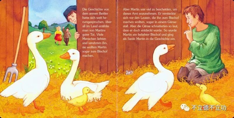 有关圣马丁躲在鹅圈的德国儿童文学插图