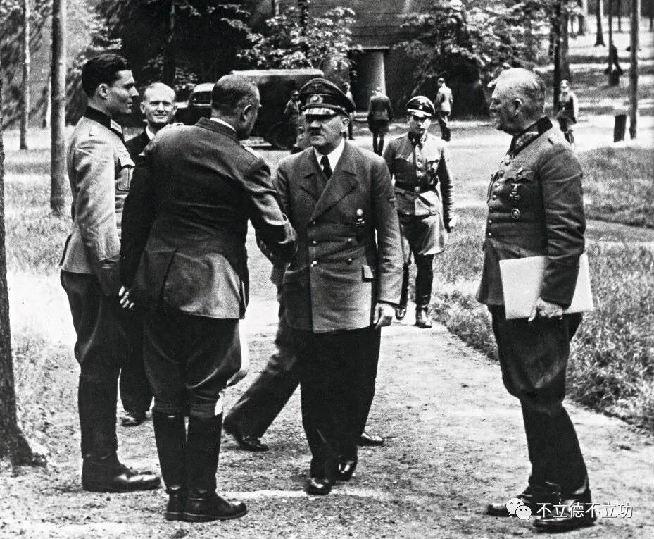 前排左起:施道丰堡伯爵上校、弗洛姆大将、小胡子、凯特尔元帅