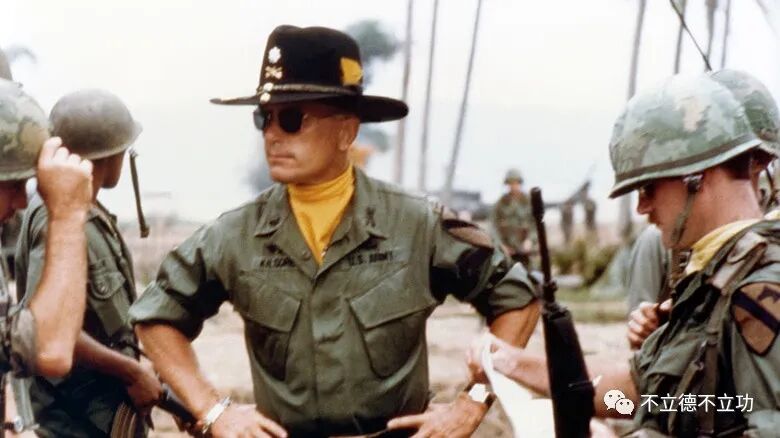 电影《现代启示录》中除了有马兰·白龙度这样的大腕,还有一个配角虽然镜头不多,却让人印象深刻,那就是率领所谓“空中突击”部队的Kilgore中校。他趾高气扬、桀骜不驯的西部牛仔像,完美符合了世界各地人们对于以霸权面目出现的美国军人的所有脸谱化想像。有意思的是,编导在细节上也考虑得非常细致。Kilgore中校的“斜杠+马头”的臂章显示,他是属于组建于1920年、但历史可以追溯到1855年的美军第1骑兵师。在导演眼中,美军的这支部队最接近于飞驰的“武神”了。