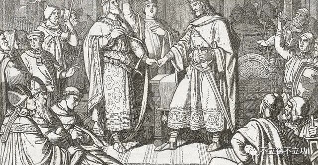 就像中国历史上的由禹到启,在西方古代历史上,在那一阶段社会发展中也是自然而然地出现世袭制。只不过叠加了社会结构、权力机制等不同的因素,又结合了历史人物各有任务的诸多变量,从而走上了完全不同的路径。西方历史上出现“选举”国王/皇帝的方式,归根到底是由于没有哪个家族能够牢固把持那几个皇/王位,而贯彻世袭制的势力也不够强大。在经由世袭而即位的查理曼大帝去世之后,他的后代没有能力经营乃父、乃祖所打造的庞大帝国。于是在843年,查理曼大帝的三个孙子订立凡尔登条约,共同三分了帝国。想想司马温公就是把“三家分晋”作为《资治通鉴》的开篇,西方这“三个孙子”分家的历史意义也重大非凡,毕竟在这基础上奠定了现代欧洲法、德、意三个大国连带一众小国的形成。