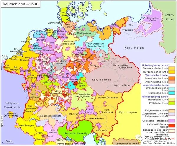 而在另外两位孙子的国度,渐渐地在共同的宗教信仰和相似的语言、文化归属的基础上,形成了一个拥奉同一个国王的“大杂烩”。之所以不敢称它为一个融合之后的王国,实在是因为境内诸侯林立,各自为政。享有国王头衔的的确是最有话语权和相对实力最强的世系,但也远不是堪比法国国王那样的集权。以罗马教廷面目介入的宗教因素形成了对王权的抑制,同时又很大程度限制了“春秋无义战”式的兼并战争。所以在千百年来,在中欧,尤其是当代德国的疆域内,一直是“百衲布”一般的版图。