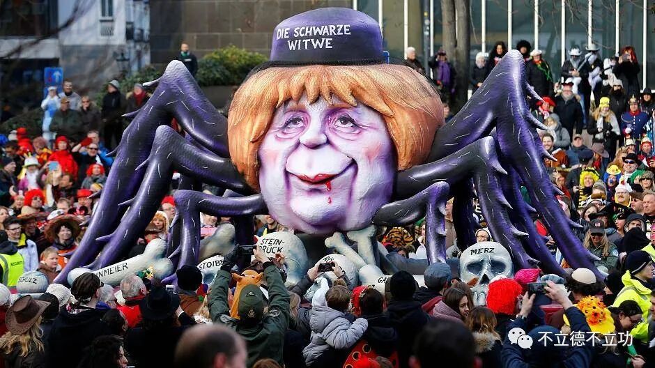 狂欢节彩车上,默克尔夫人的“黑寡妇”造型