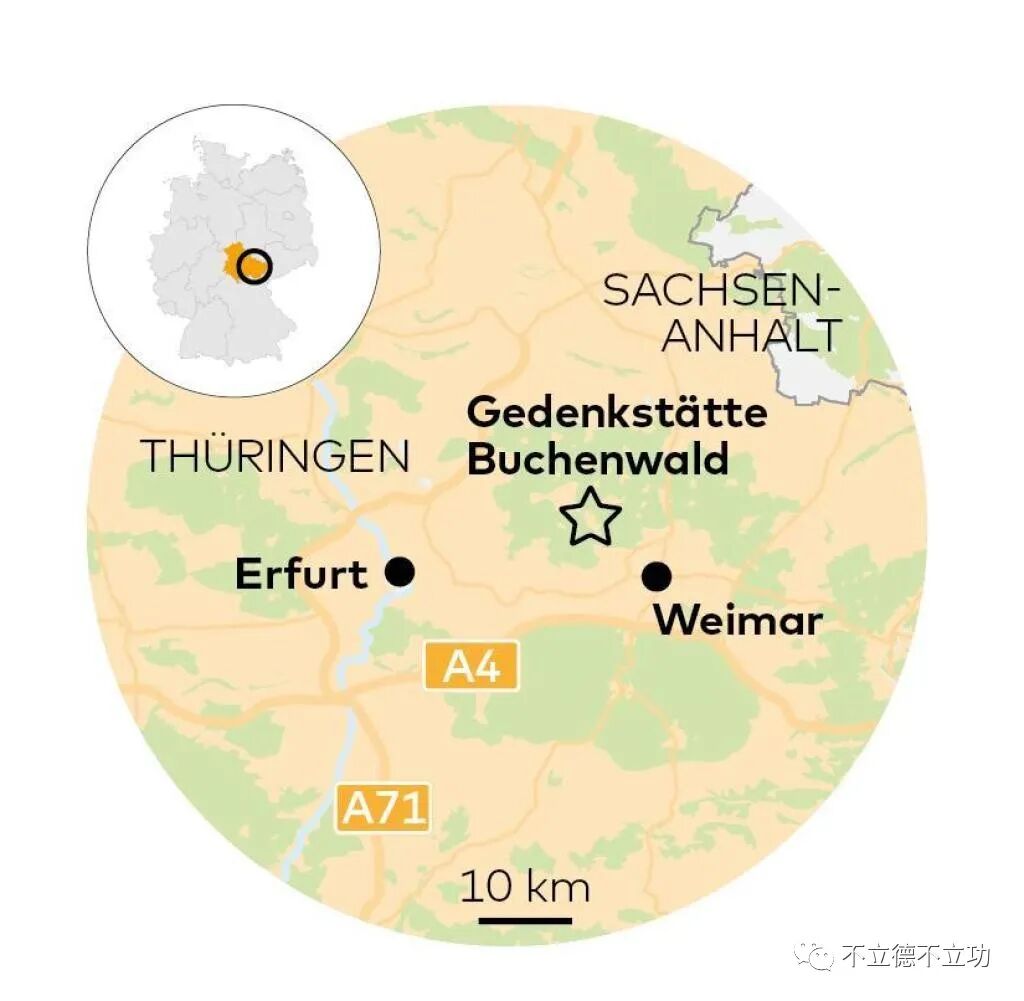 在魏玛共和国覆灭之后,小胡子的统治首先表现出来的是对内的各种残酷镇压,出于政见对立、出于内部权斗、出于种族压迫……从离开慕尼黑差不多一小时车程的达豪(Dachau)开头,纳粹们首创了大规模集中营的囚禁模式。后来,在离开魏玛仅仅十公里处的布痕瓦尔德(Buchenwald)也设置了集中营,日后更是成为德国本土规模最大、最重要的集中营。布痕瓦尔德这一词来自德语“山毛榉树/Buche”和“森林/Wald”的组合,魏玛郊外不远处的这一片地区已经是属于图林根森林(Thüringer Wald)人烟稀少的地带。而不知名的中国译者之所以在音译布痕瓦尔德时选取了“痕”这个词,想必是顾念到了集中营的惨绝人寰所带来的肉体、心灵伤痕。