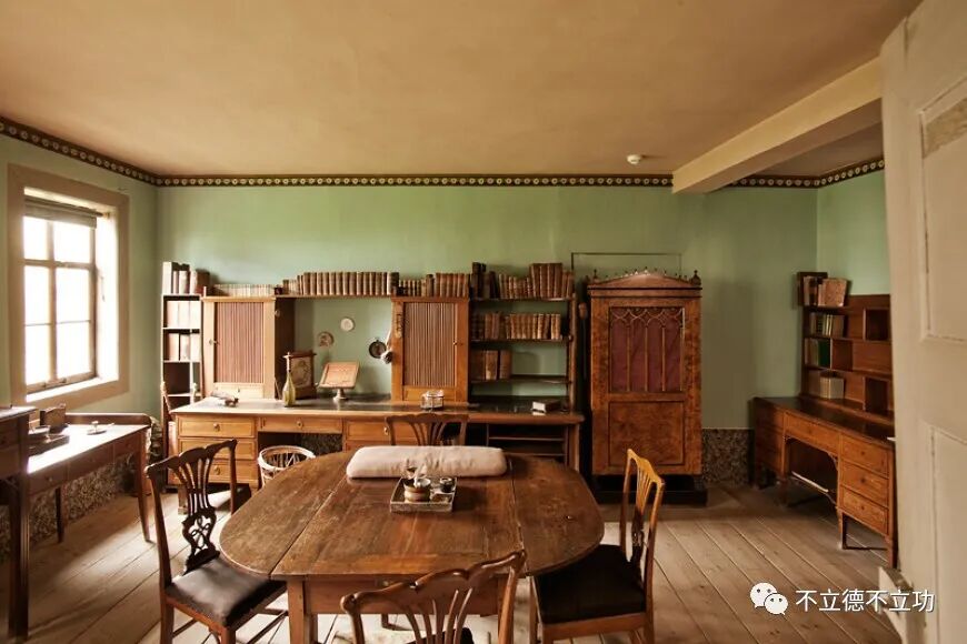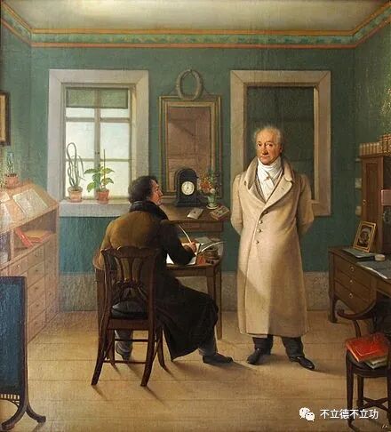 不同于典出战国的成语故事“千金买骨”,通过任用歌德,魏玛公国是把域中冉冉上升的最耀眼一颗文曲星延请了过来。歌德从此与魏玛结下了不解之缘,直到他最后于1832年在此地去世,一生中在这里创作了无数作品。也使得魏玛成为文人雅士心目中的形胜之地,吸引仰慕者们前来求见,简直就如同李白笔下的“生不用封万户侯,但愿一识韩荆州”。渐渐的,在魏玛齐集、交游了德语区知名的学者、诗人、哲学家。“谈笑有鸿儒,往来无白丁”,言必谓家国人生、语不及尘俗烟火的沙龙辩论、花园集会成为了小小魏玛城可以比肩甚至可以鄙薄那些大都市的自豪之所在。其高雅、其盛壮,堪比中国历史上东晋永和九年(公元353年)在绍兴兰亭的曲水流觞之会。在后人推比其情而想象的油画里,歌德与席勒是众人中最耀眼的双星。