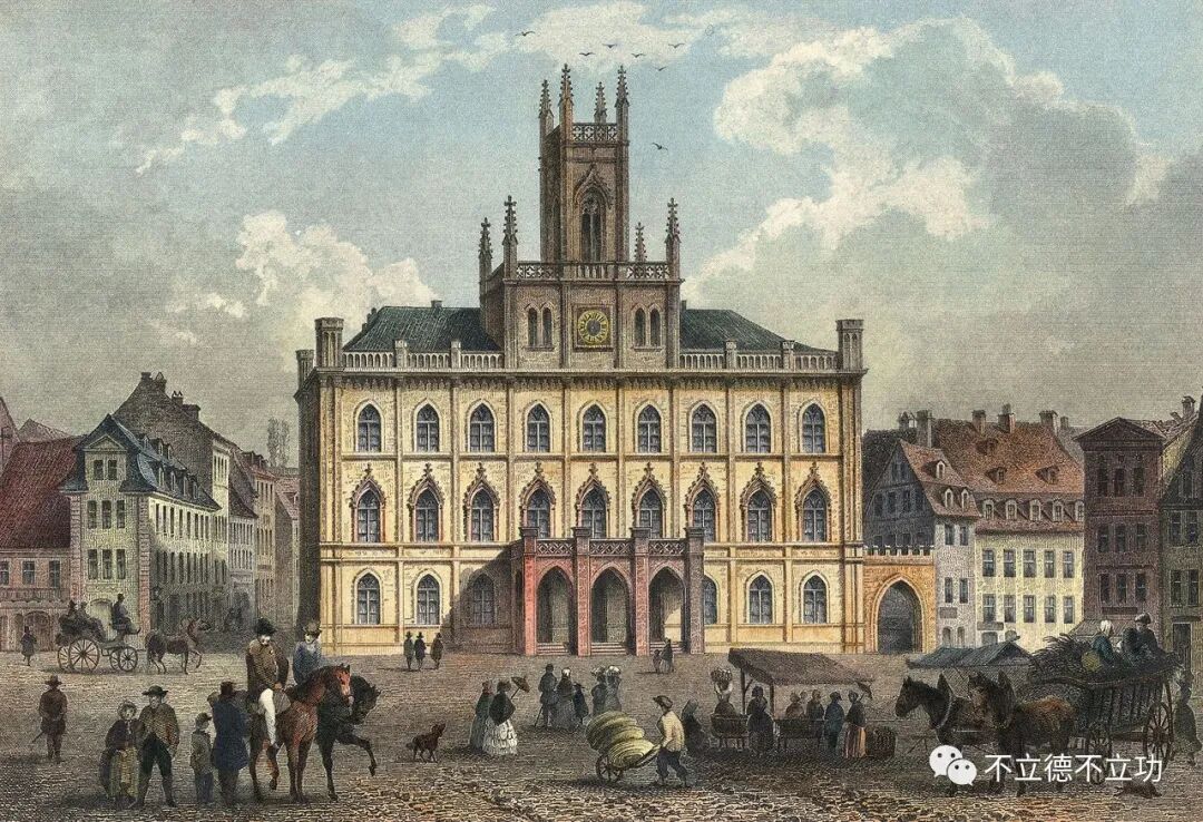 直到俾斯麦完成统一,并没有真正意义上的德国,只是邦国林立的“百衲布”。虽然说着口音差不多的语言,但也是直到马丁·路德翻译了圣经,才实质上“统一”了语言而由此定制为现代意义上的德语。在整个中世纪,魏玛只是德语区内一座名不见经传的小集镇而已。魏玛从1547年起是萨克森―魏玛/Sachsen-Weimar(日后又改称:萨克森―魏玛―爱森纳赫/Sachsen-Weimar-Eisenach)公国的首府。不同于冠名中有相似处的萨克森王国,更西边些的萨克森位列七大选帝侯(见前文《“裤裆大街”上的选帝侯》)之一,而萨克森―魏玛―爱森纳赫是在拿破仑垮台后的维也纳和会上才晋级为大公国,但其实只是一片地幅颇小而又支离破碎的领地。