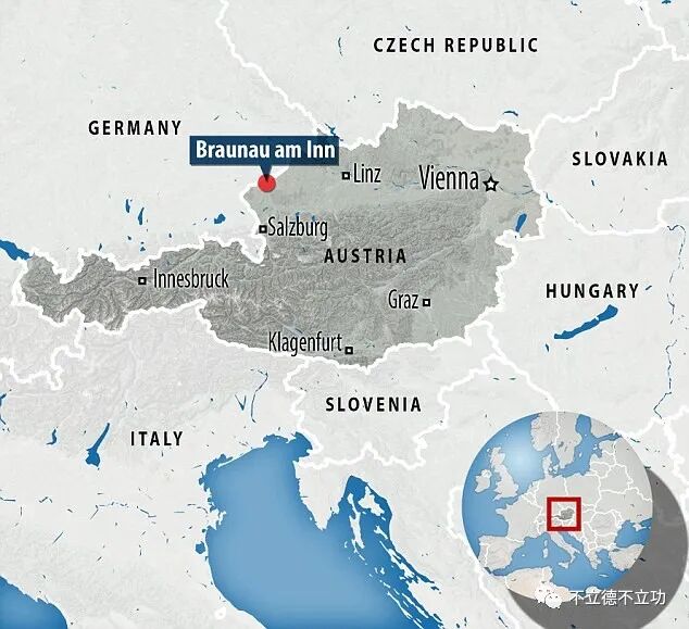 虽然处于边界,自巴伐利亚王位继承战争结束之后,从1789年起,布劳瑙就一直属于奥地利。有道是“十年树木,百年树人”,整整一百年后。谁料想等来了小胡子投胎到这里,何等的讽刺!另一方面,这一带的生活习惯乃至口音也更像近在咫尺的巴伐利亚,而不是远在东边差不多三百公里以外的帝都维也纳——实在不能想象,以小胡子那充满火药味的演说词,不是用他那特别夸张的巴伐利亚腔大舌音,倒是配上软糯而带飘乎乎尾音的维也纳声调,那会是什么效果?虽然刚刚成年的小胡子确实来到维也纳追寻他的艺术梦想,但两次投考维也纳美术学院的失利,使得他甚至落魄到一度在那里流浪(见前文:《今年最冷的笑话》)。谁曾想得到,在1938年,他作为德国的“元首”,成功吞并了奥地利而“衣锦还乡”。