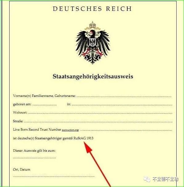 当年德意志帝国国籍证书,红色箭头指出的是1913年颁布的“帝国国籍法”
