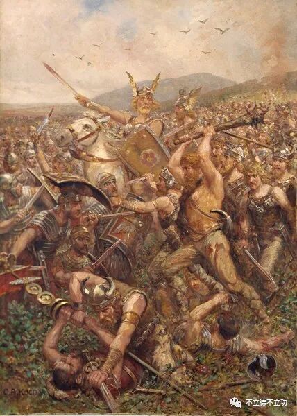 改变历史走向的是公元后9年的条顿堡森林之战。当时,罗马帝国派驻莱茵行省的总督瓦鲁斯率领三个正规军团进剿日耳曼各部,被日耳曼各部联军的首领阿尔米尼乌斯引诱至条顿堡森林地带的埋伏圈。罗马军团在四面埋伏、分段截击中全军覆没、片甲不留,统帅瓦鲁斯自杀。
