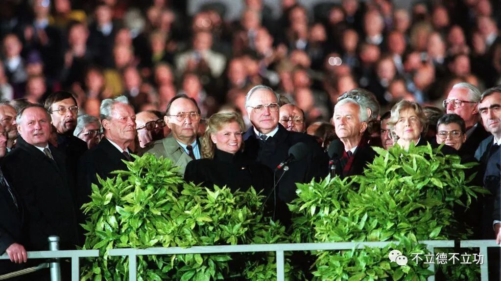 也正是在欢欣鼓舞和高度的历史敏感纵使之下,1989年11月10日晚——柏林墙被“洞穿”从而倒塌的第二天——在当时仍处于分裂状态的西柏林市政厅前举行的庆祝集会上,西德几乎所有的政府要人和朝野各党的要角都同台聚集。站在C位的是执政已满7年的西德联邦总理赫尔穆特·科尔(Helmut Kohl)——虽然在宪法序列中,联邦总理只是排在联邦总统和联邦议院议长之后的第3位,但却是毫无疑问掌握着最高政治权力的。所以,作为国家元首的联邦总统理查德·冯·魏茨泽克(Richard von Weizsäcker),其站位是在科尔夫妇的身侧。