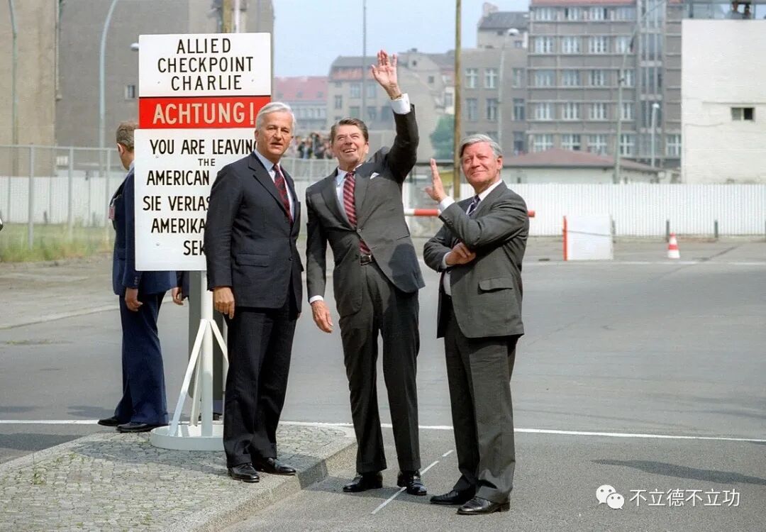 尚为西柏林市长的冯·魏茨泽克陪同美国总统里根和西德总理施密特在著名的查理检查哨(Checkpoint Charlie)地段走访柏林墙(就是背景中的那道墙)