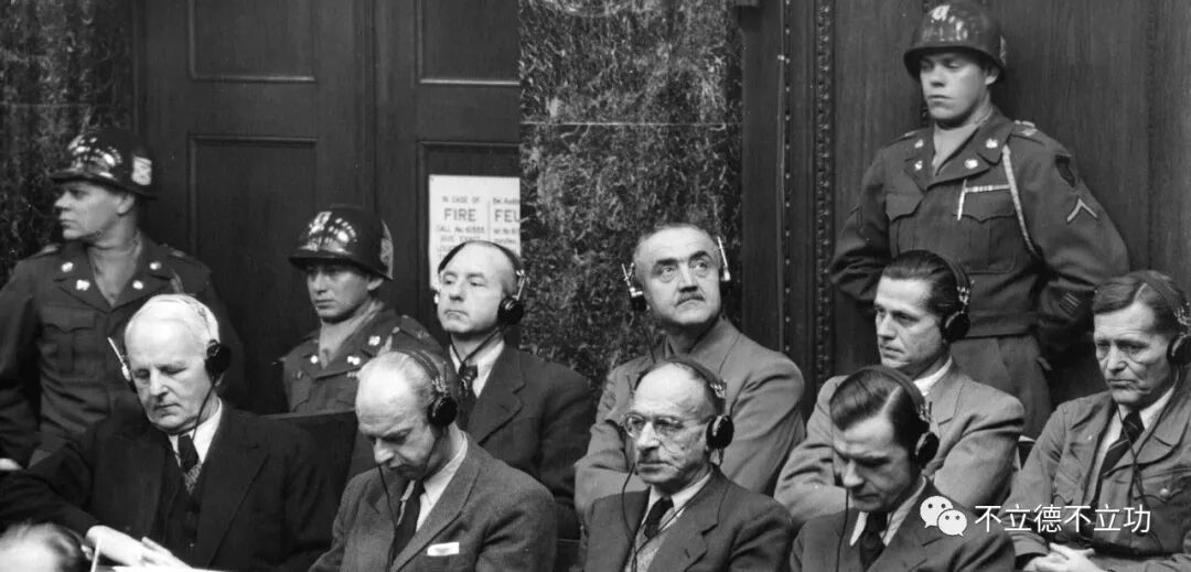 恩斯特·冯·魏茨泽克(左一)在纽伦堡国际军事法庭的被告席上
