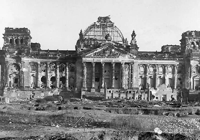 一九四五年五月柏林被攻克后的国会大厦(“大方顶”被战火毁坏到只剩骨架)