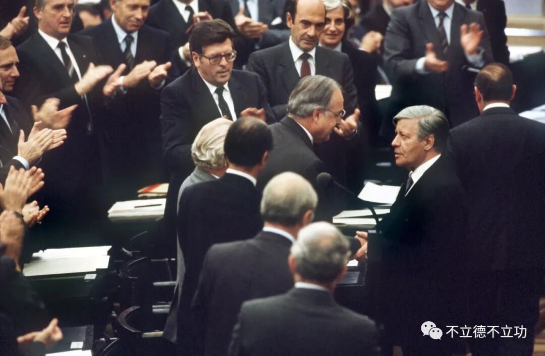 1982年10月1日,“建设性不信任案”获得通过后,卸任总理施密特向新当选的联邦总理科尔表示祝贺