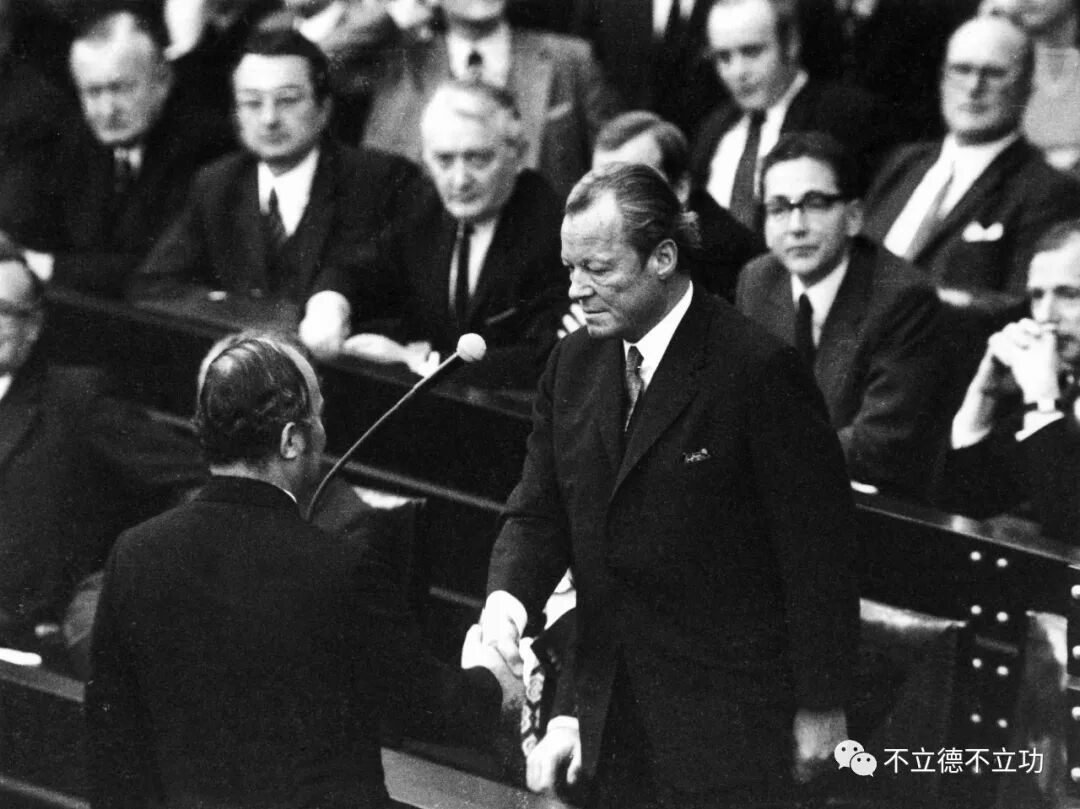 “建设性不信任案”未获通过后,反对党党首巴泽尔(背对镜头)向勃兰特总理表示祝贺