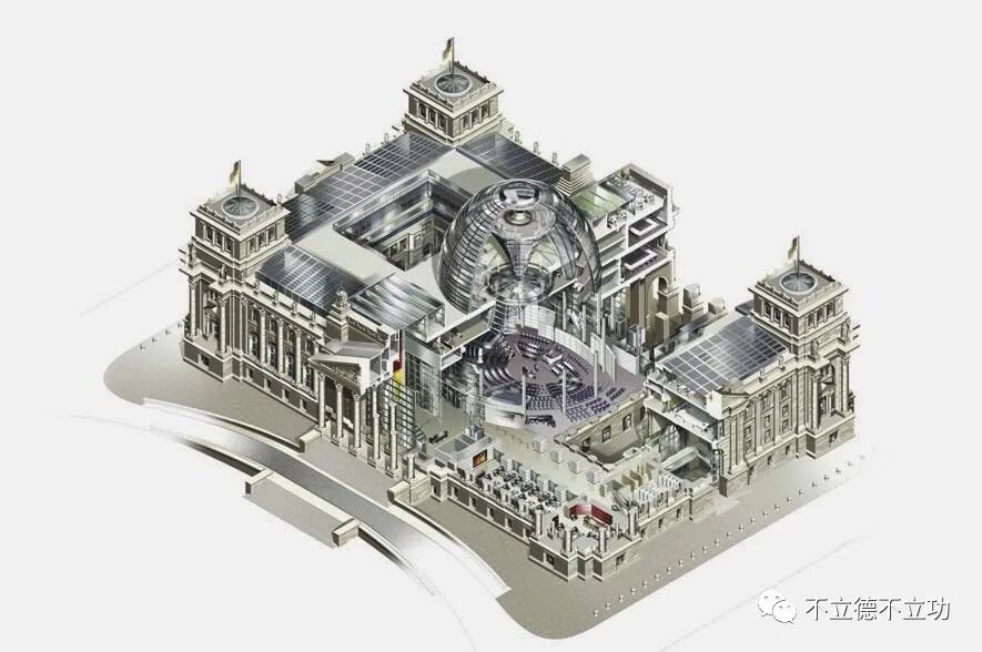 德国统一后改建的国会大厦示意图(新修了现代式样、象征透明度的玻璃“穹顶”)