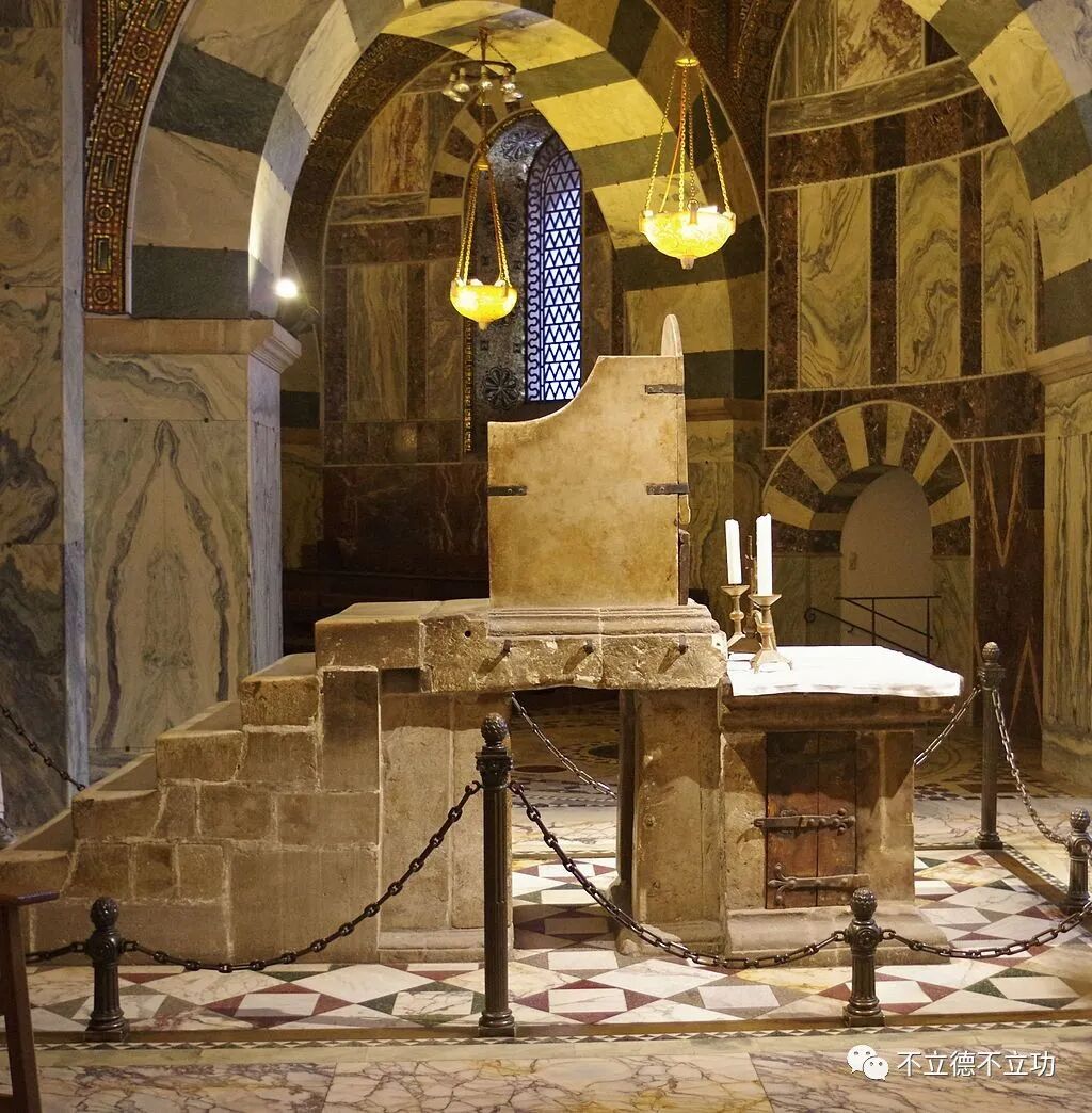 在获得教皇的加持,从而得以称帝之前,奥托一世先是于936年在亚琛继承查理曼大帝的法统而登上王位。他在这一加冕仪式上用的就是当初查理曼大帝的石板宝座,从此奠定了德意志国王/皇帝在亚琛接受加冕的传统。几百年间,前后总共有31位国王/皇帝坐上这张在不少“土皇帝”看来确实很“土”的“龙椅”。