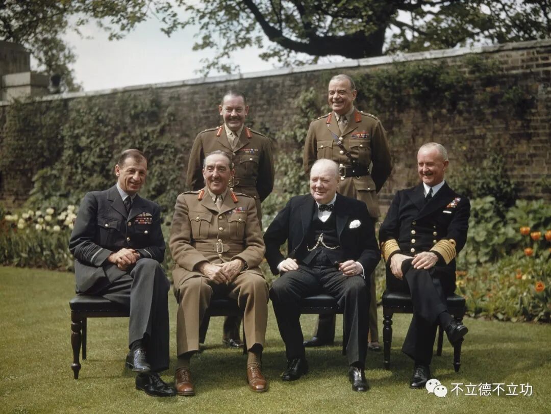 丘吉尔与英军最高层将领合影,前排左起:查尔斯·波特尔空军元帅、艾伦·布洛克陆军元帅、丘吉尔、安德鲁·坎宁安海军元帅,后立左起是哈罗德·亚历山大陆军元帅、黑斯廷斯·伊斯梅陆军上将