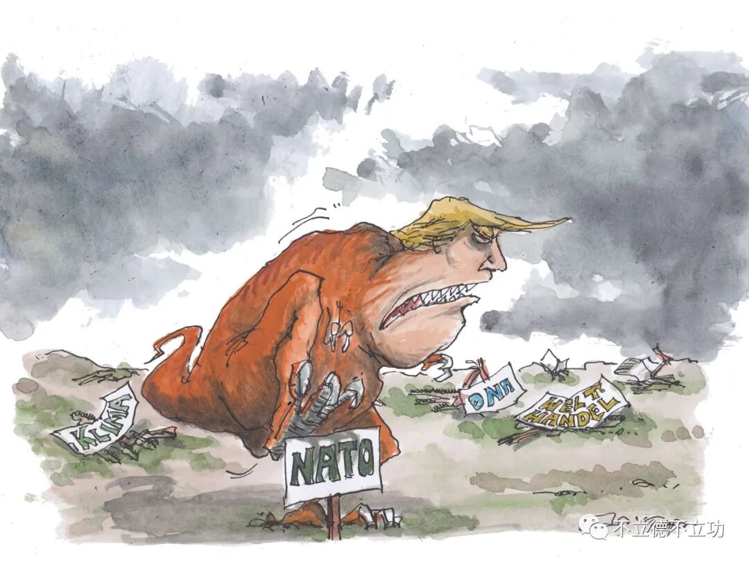 德国漫画:以“霸王龙”形象已经践踏了联合国、世贸组织、气候公约,正起脚要踩向北约的特朗普