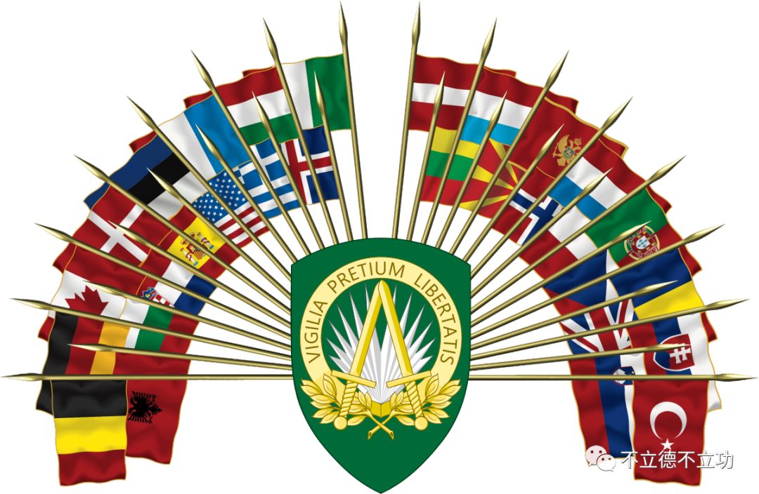 北约个成员国的国旗及其最高统帅部徽记,上面的拉丁文格言(VIGILIA PRETIUM LIBERTATIS)意为:“警惕是自由的代价。”