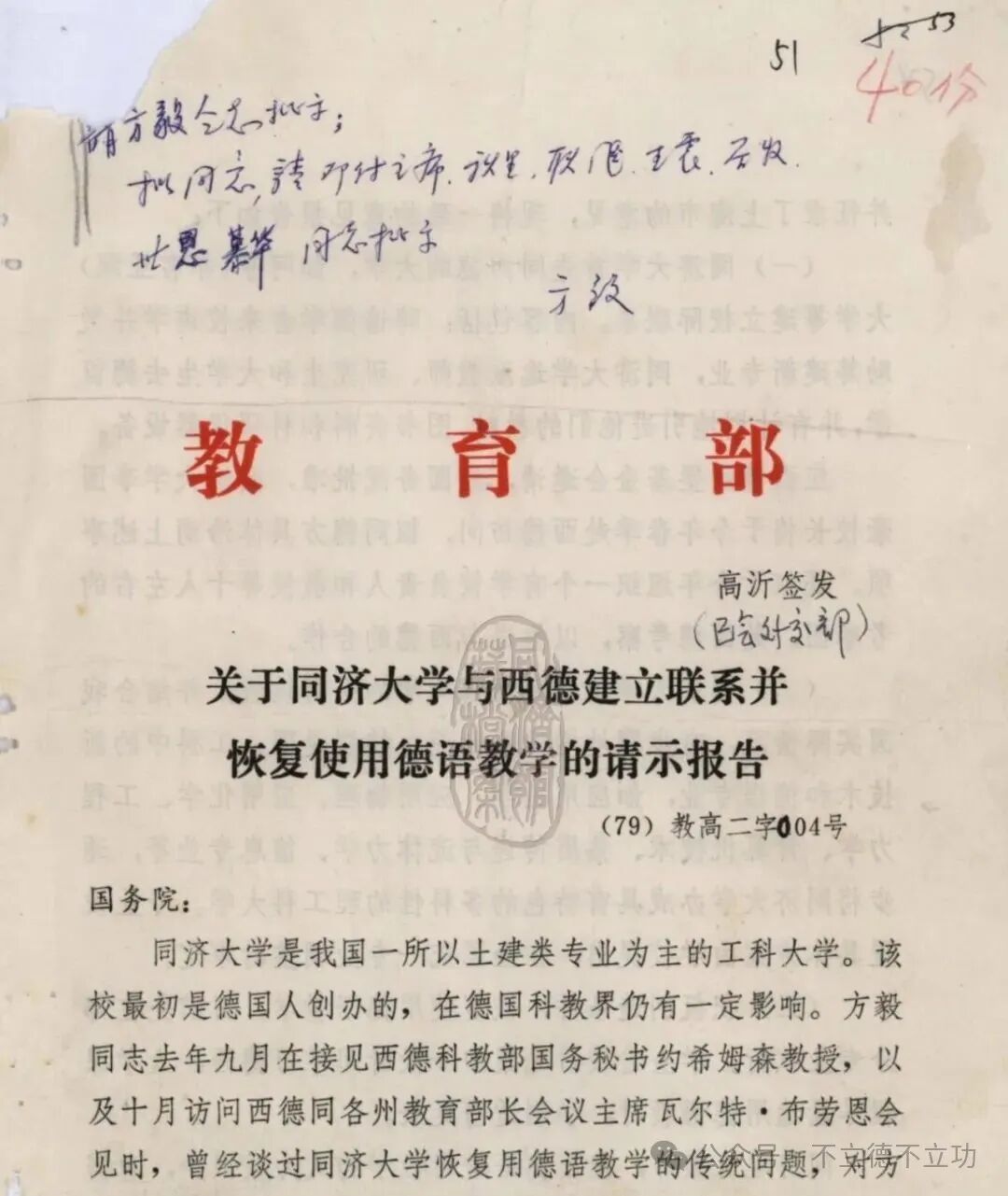 同济大学的前身是德国医生埃里希·宝隆(Erich Paulun)于1907年创办的同济医院和上海德文医学堂,在同济的百多年校史中一直有着与德国社会各界、学术界的紧密交往和丰富交流。同济多个系科、专业有着用德语教学的传统,不但在上海,在全国也是独树一帜的。在1976年的“十月里,响春雷,八亿神州举金杯”之际,拨乱反正后的重开国门也给同济带来了重新扬帆起航的机遇。正是在这一背景下,当年的同济大学校长、中国土木工程学与力学的一代宗师李国豪教授就领衔向教育部、国务院提交了《关于同济大学与西德建立联系并恢复使用德语教学的请示报告》。这份由国务院当时分管科教的副总理方毅亲笔批复,并得到邓公、余秋里、耿飚、王震、康世恩、陈慕华等领导人批示同意的报告是同济校史上的里程碑式珍贵文件。