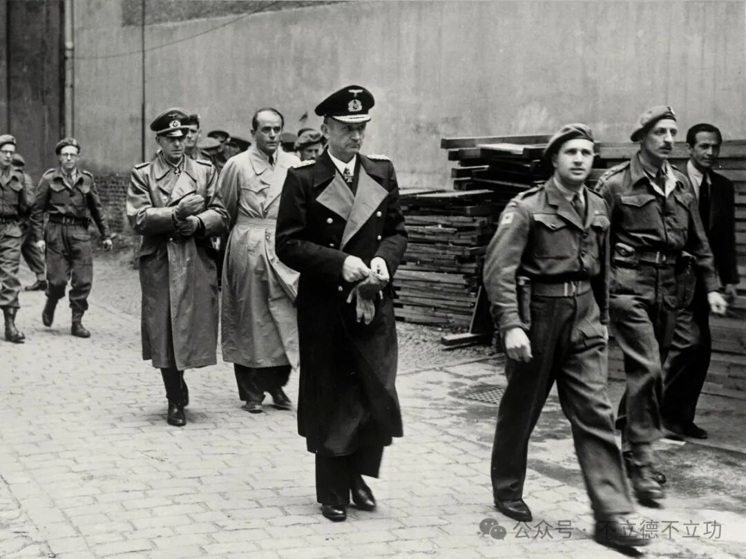 1945年5月23日,德国海军元帅邓尼茨(中,穿海军大衣者)与军工部长施佩尔(穿风衣者)、最高统帅部作战部长约德尔大将(穿皮大衣者)一同被逮捕