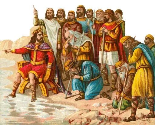 有关克努特大王,流传下来的是他在海边命令涨潮的海水从自己的脚下退去的故事,仿佛一个狂妄而无知——尤其是不知道自己权力之界限——的君王形象跃然而出。而实际上却是,克努特大王为了给身边的阿谀逢迎之徒一个教训,把他们带到海边,先是演了那出喝退涨潮海水的荒诞剧,然后据英国儿童文学《克努特国王在海边(King