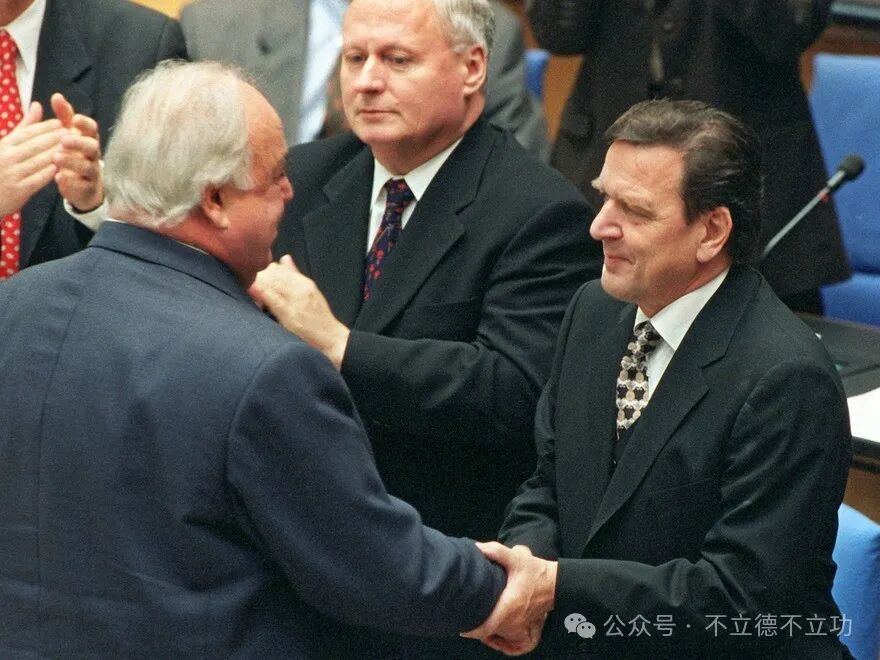 科尔向刚刚当选为联邦总理的施罗德表示祝贺,中间的是拉方丹