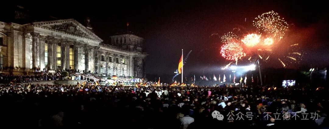 1990年10月3日东、西德国正式统一,在柏林国会大厦前的庆祝场面