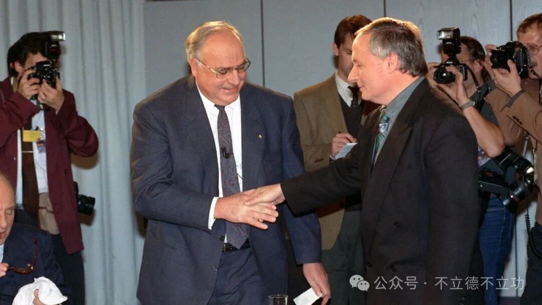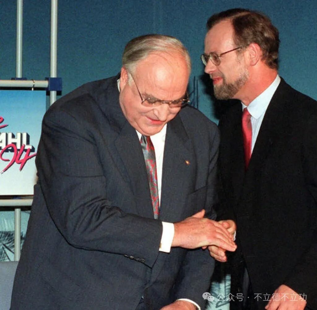 在这三人的党内竞争中率先当选为党主席的居然是大家始料不及的沙尔平,毕竟论资历、形象和为人所能感知的能力,他都是逊于拉方丹和施罗德的,奈何他有鹬蚌相争、渔夫得利的运气。更何况,在1993年三人竞选新一届党主席的辩论会上,并不怎么善于辞令的沙尔平可能达到了他平生的巅峰水平。相比之下,平时都能言善辩、词锋机敏的拉方丹和施罗德两位,在那一天表现得不过尔尔。于是,在翌年的联邦大选中,沙尔平就作为又一位社民党总理候选人出战。即便是在统一后,德国经济受东德地区影响一度萎靡不振,而科尔政府的经济政策又被广泛诟病的情况下,科尔依然能够并无悬念地连任。微妙处在于,科尔领衔的联盟党的得票率从四年前的43.8%下滑到41.5%。而社民党在领头人劲道不足的情况下,还是得以从四年前的33.5%略有反弹到36.4%,其间的趋势隐隐。