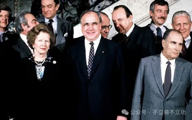 前排左起:英国首相撒切尔夫人、德国联邦总理科尔、法国总统密特朗