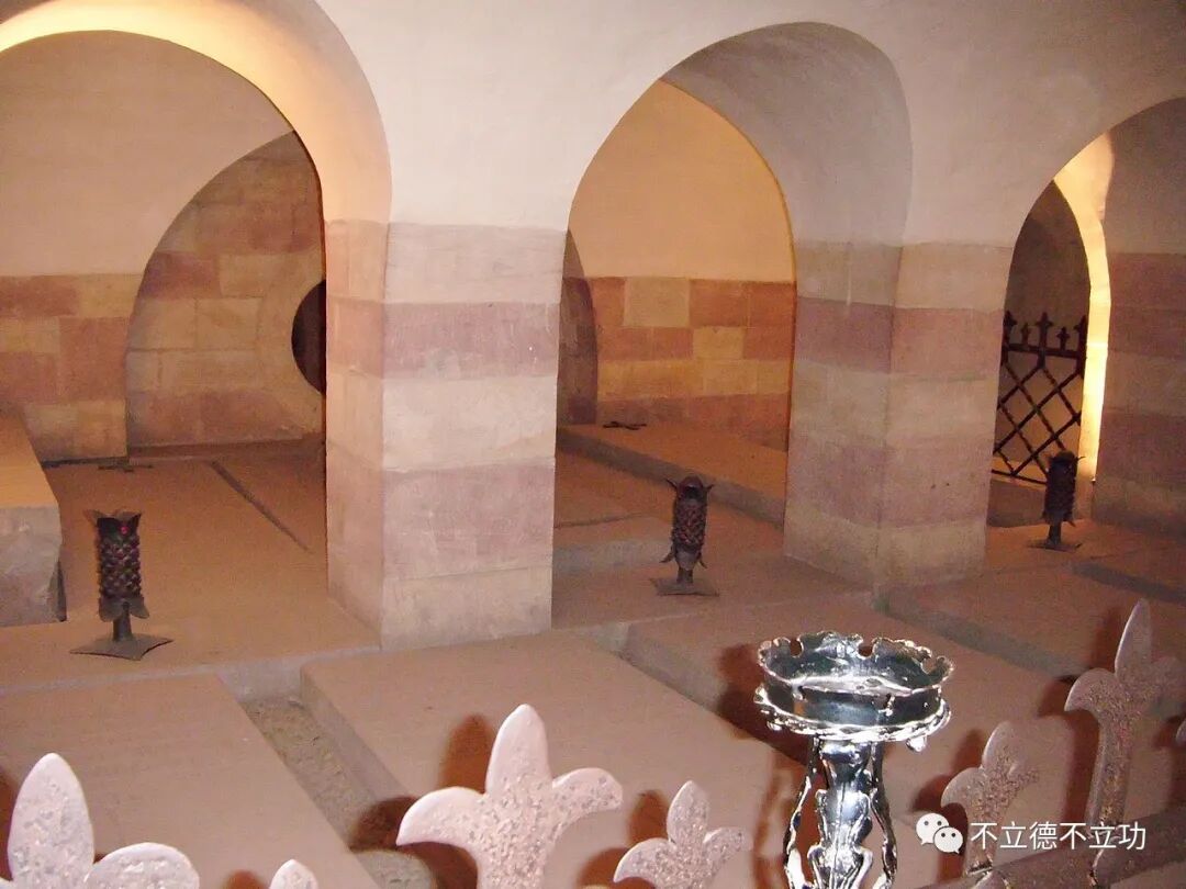 直到亨利四世去世那年,斯派尔大教堂方得以竣工。亨利四世也就被葬在斯派尔大教堂的地宫中,与他葬在一起的还有同出自萨利安家族的其他几位皇帝。在花岗岩至为洗练的刻意简朴中,在几块一、两米见方的大石板之下的尺寸之地,就安息着几位在世时曾嫌欧洲大陆还不够大的神圣罗马帝国的皇帝们。这就是西方传统之下的“古今‘帝王’在何方?荒冢一堆草没了。”