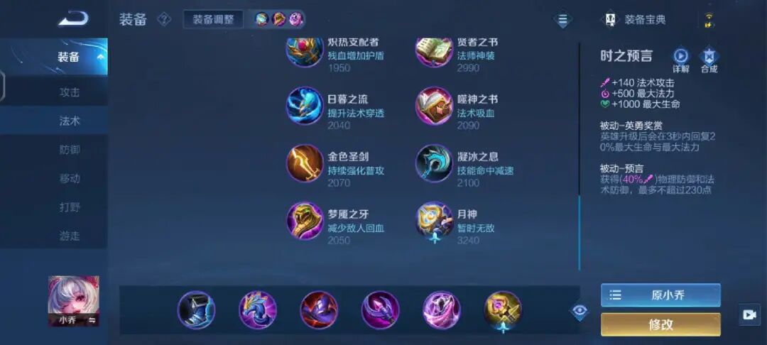 这是很多小乔玩家通用的一套出装,第一栏秘法之靴,然后回响之杖,之后就做噬神之书,然后分别是博学者之怒、辉月以及虚无法杖。